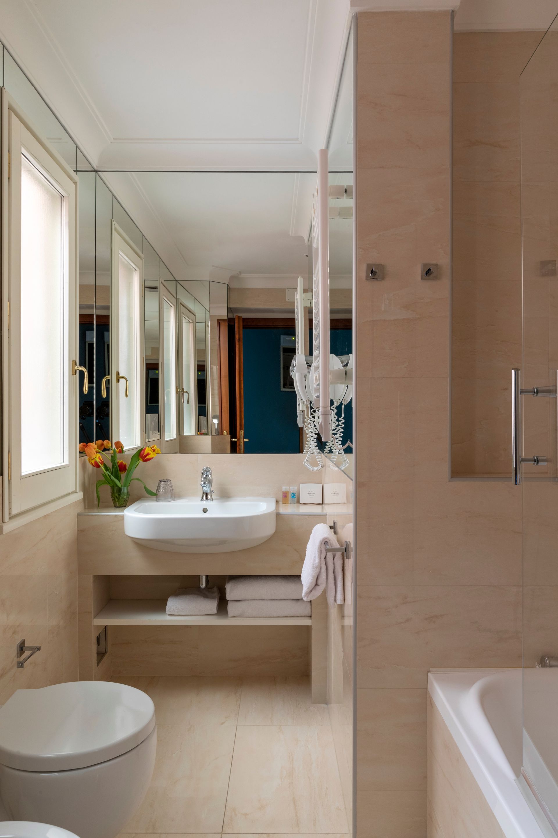 Spacious suite of 50 square metres, which can accommodate up to 7 people. It consists of 3 separate rooms, but connected by way of a small hallway, with 3 queen-size or king-size beds (160 or 180 x 200 cm) and a single bed (90 x 190 cm). Each room has en-suite bathroom, with shower or tub/shower and hairdryer and all amenities: air conditioning HD led TV, SKY channels, free Wi-Fi, complimentary water in the minibar, kettle for coffee and tea, telephone and electronic personal safe.
