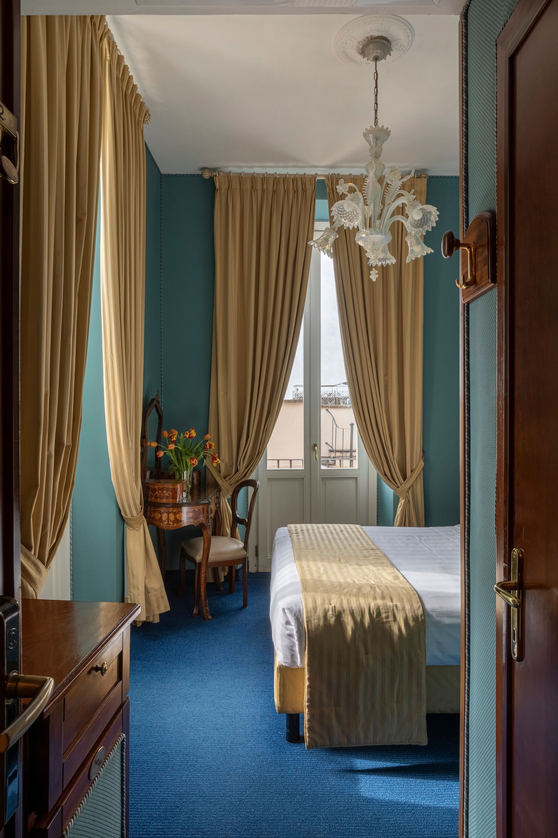 In the separate building, suite of 50 square metres, which can accommodate up to 5 people. It consists of 2 connecting rooms, with 2 windows and 2 scenic balconies overlooking Piazza di Spagna and Piazza Mignanelli. The first room has 1 king-size bed (180 x 200 cm) or 2 single beds and the second room has two single beds (90 x 190 cm) whereby a third bed may be added. One en-suite bathroom, with shower, hairdryer and all amenities: air conditioning, HD LED TV, SKY, free wi-fi, free water in the minibar, kettle for coffee and tea, telephone and personal electronic safe.