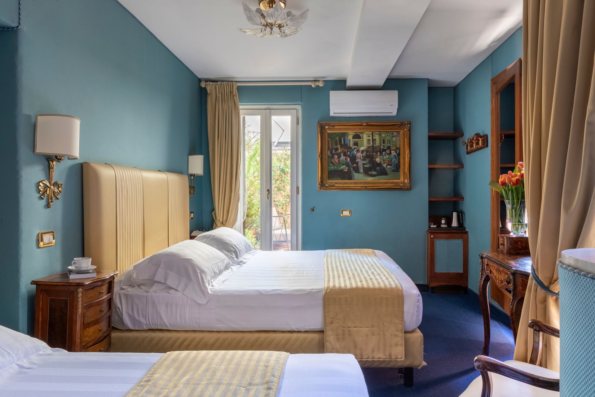35 square metre suite, which can accommodate up to 5 people. It consists of 2 separate, but connecting, rooms with scenic balconies on the rooftops and domes of Rome. It has 2 queen-size and king-size beds (160 or 180 x 200 cm) and a single bed (90 x 190 cm). Each room has its own bathroom, with shower or bathtub/shower and hairdryer and all the comforts: air conditioning, HD LED TV, SKY, free wi-fi, free water in the minibar, kettle for coffee and tea, telephone and electronic safe.